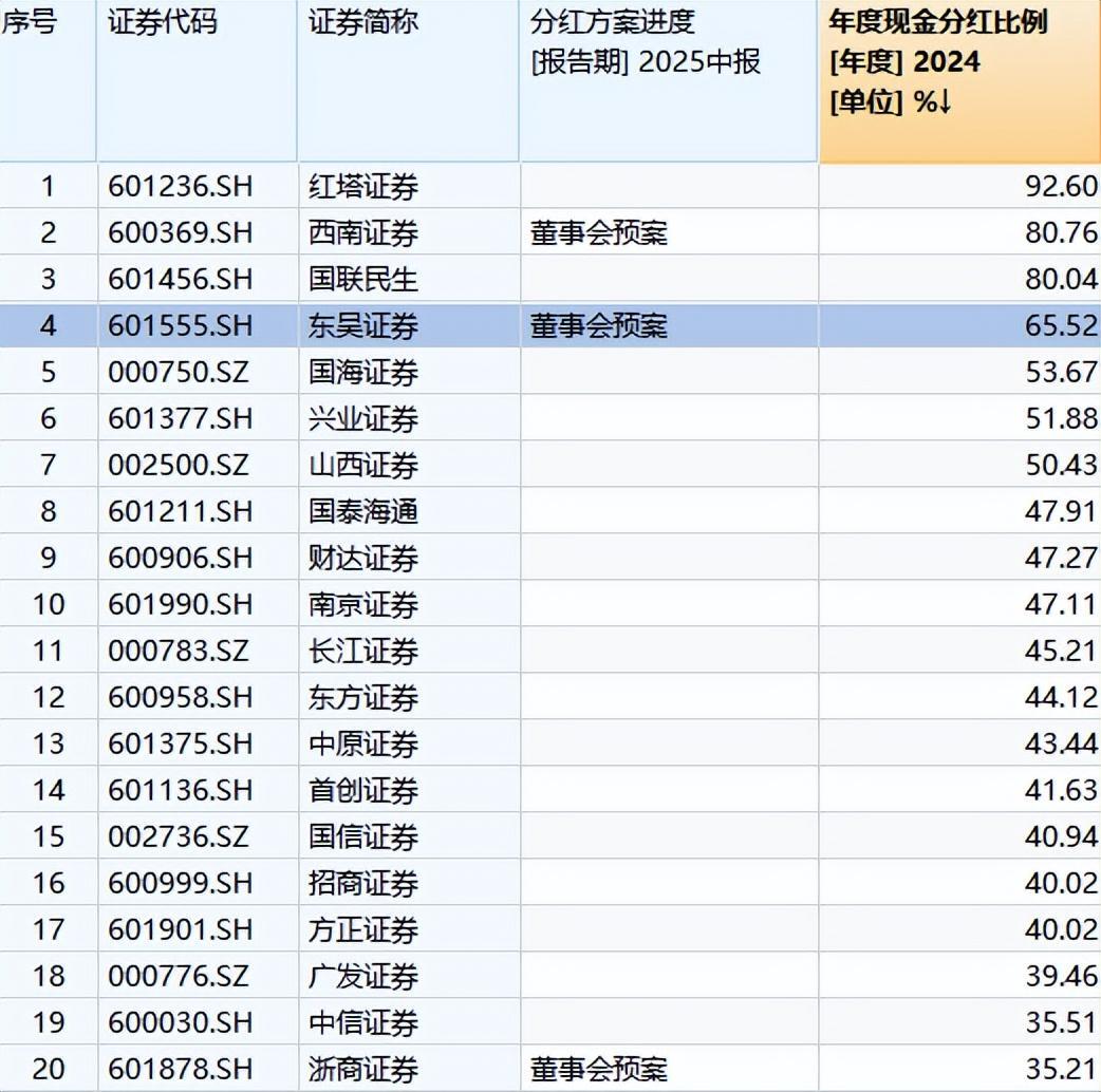 回顾2024年,东吴证券合计派发现金红利15.5亿元,占当年归母净利润的比例高达65.52%,高居A股上市券商第四位。