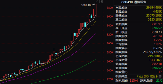 通信设备概念股今日强势上攻,板块指数继昨日逆市上涨后,今日再度飙涨近8%,创去年10月以来最大单日涨幅,并再一次刷新历史纪录。鼎通科技、天孚通信等20%涨停,长芯博创、长飞光纤、特发信息(维权)等涨停或涨超10%。